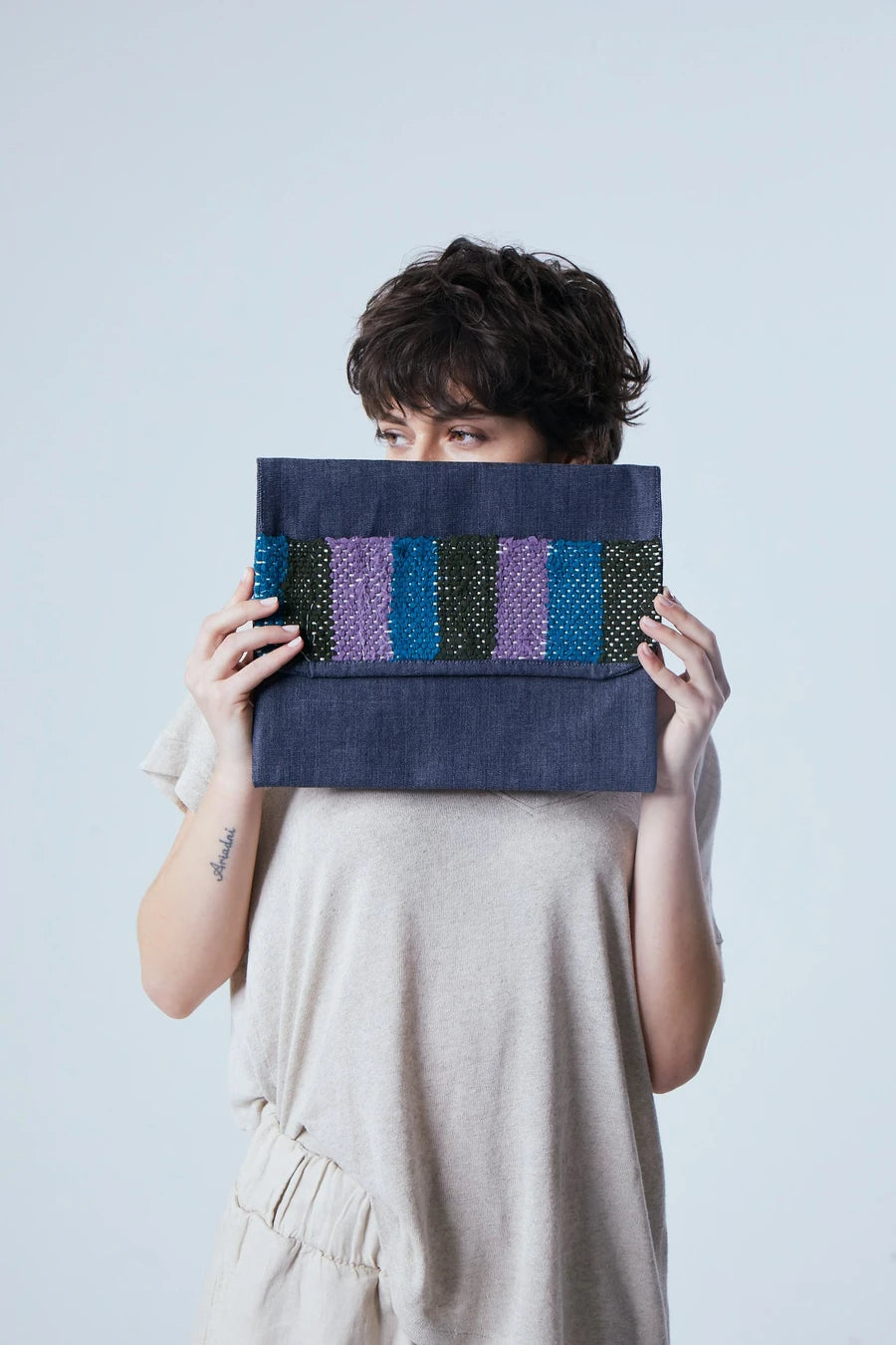 Each Clutch in the Mixed Series is unique. Hand-woven clothing is a design combined with belt pieces. The hand-woven belts were made by the İlkadım Women's Cooperative, and the bags were sewn by the craftsmen in the Zeytindalı women's cooperative.