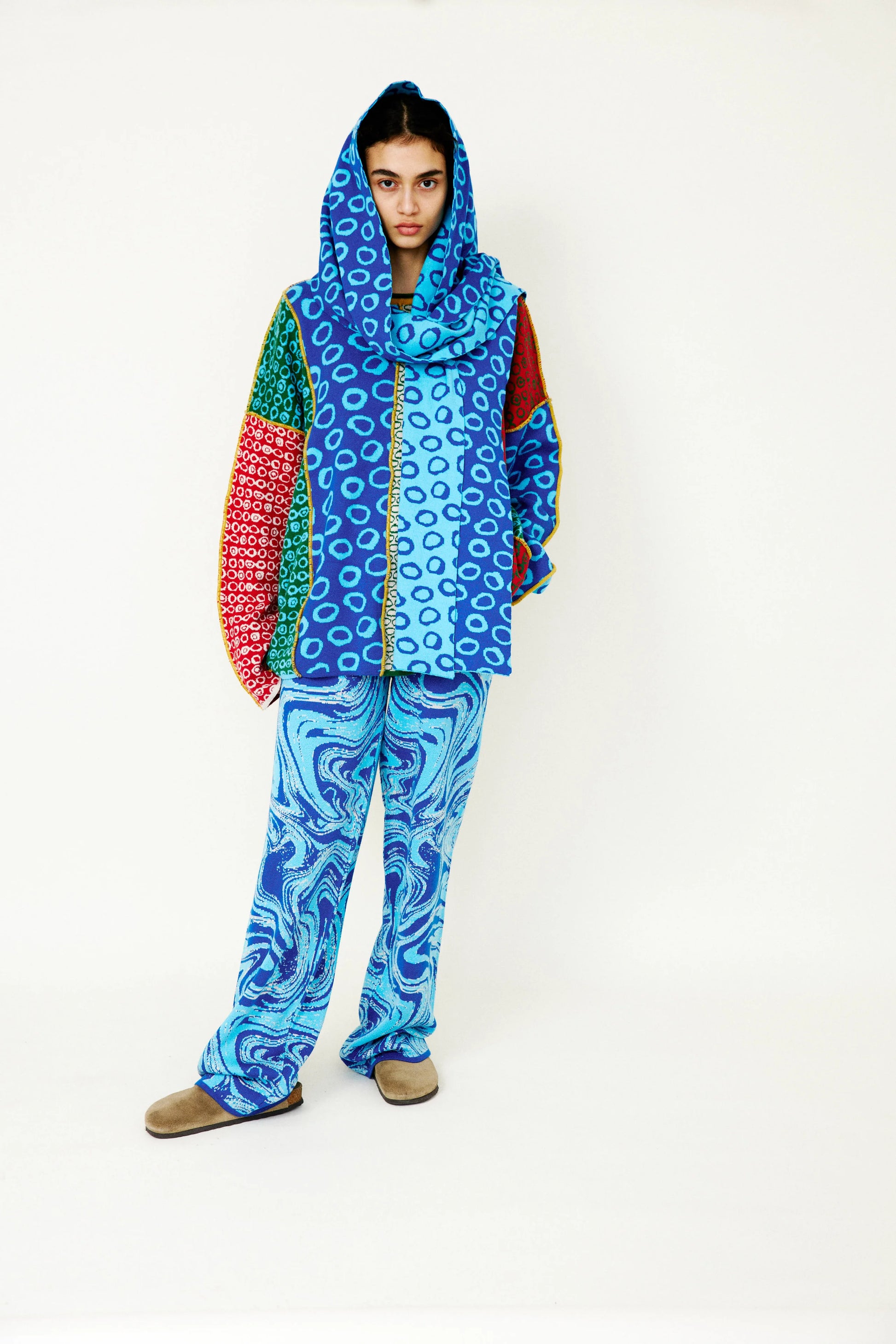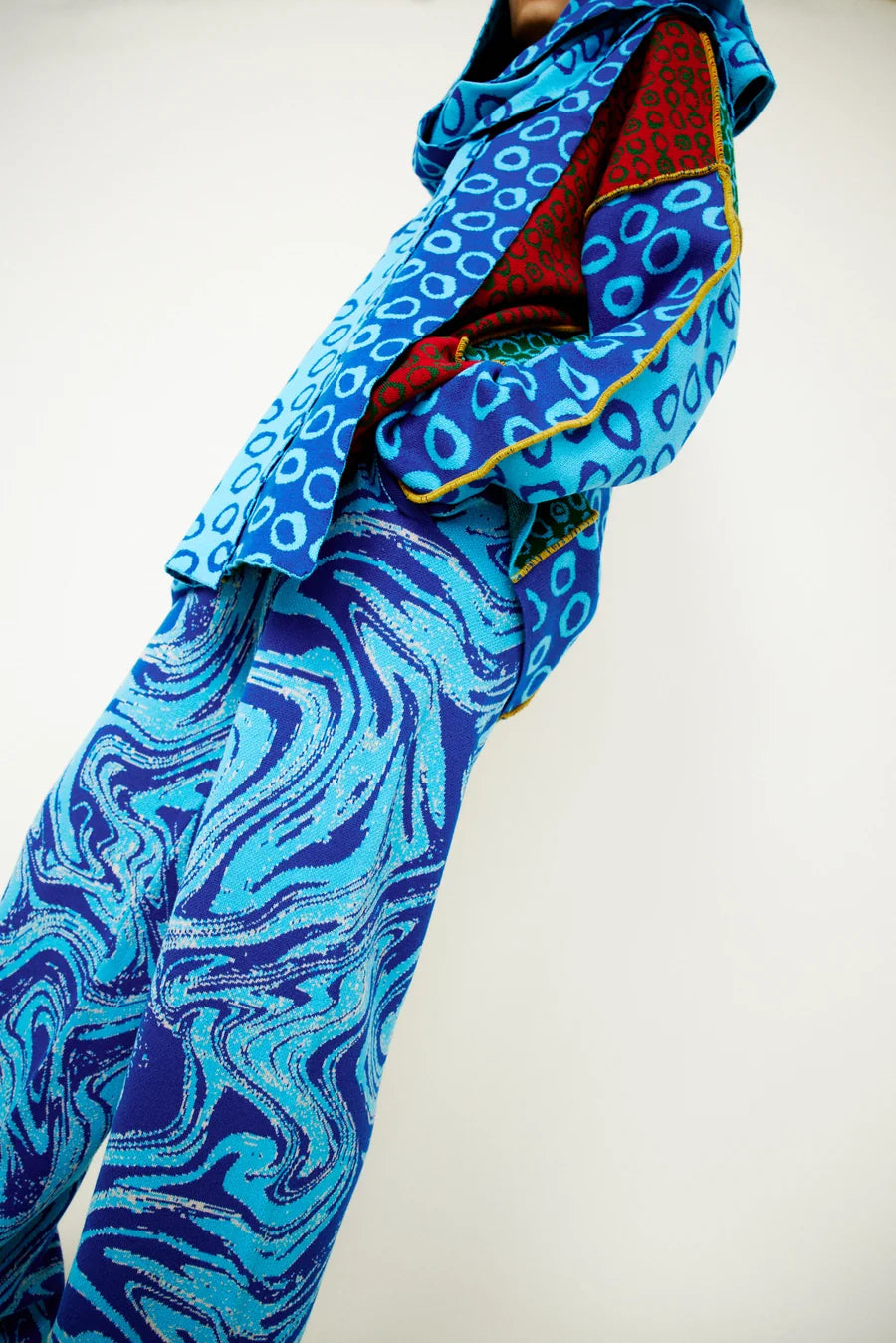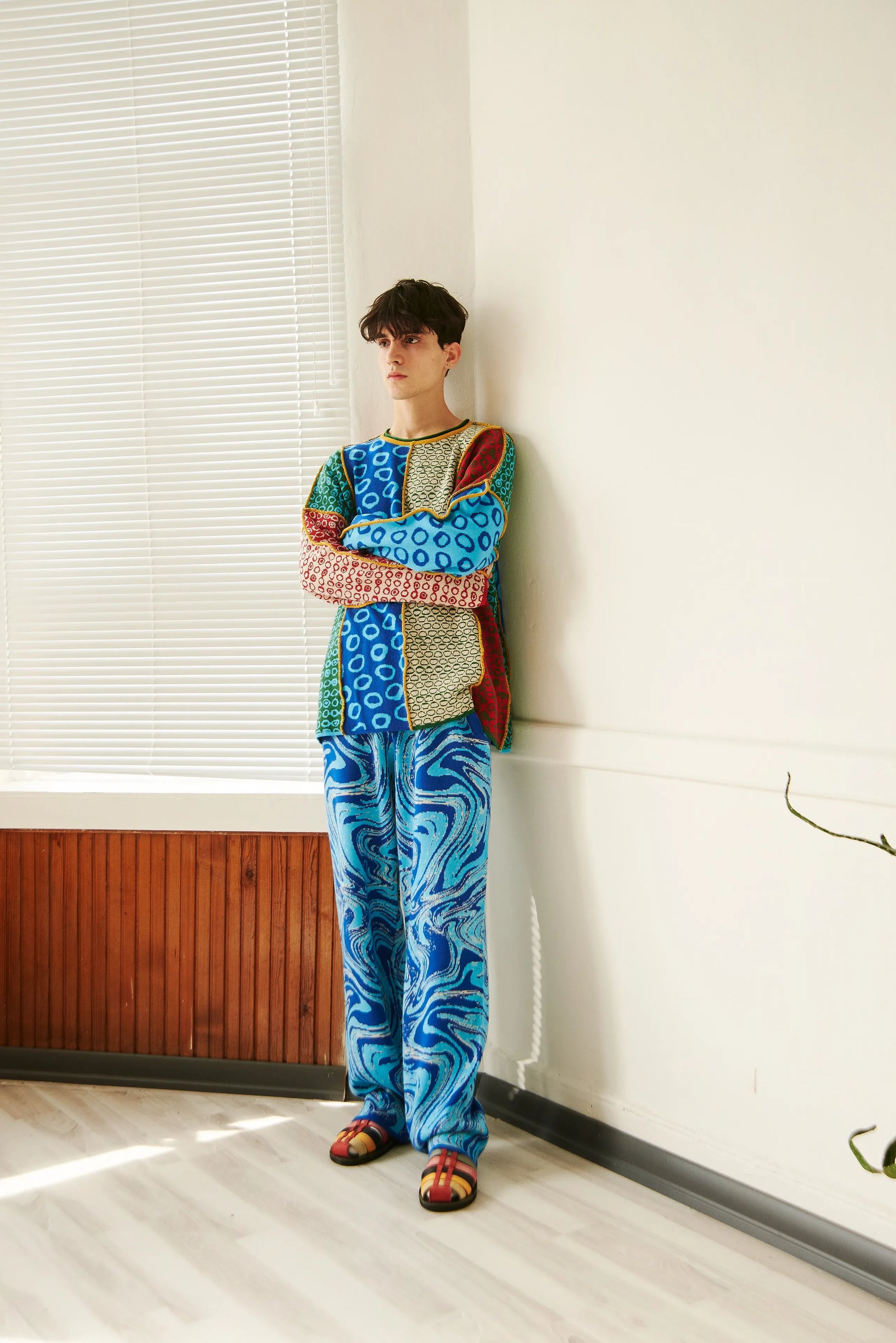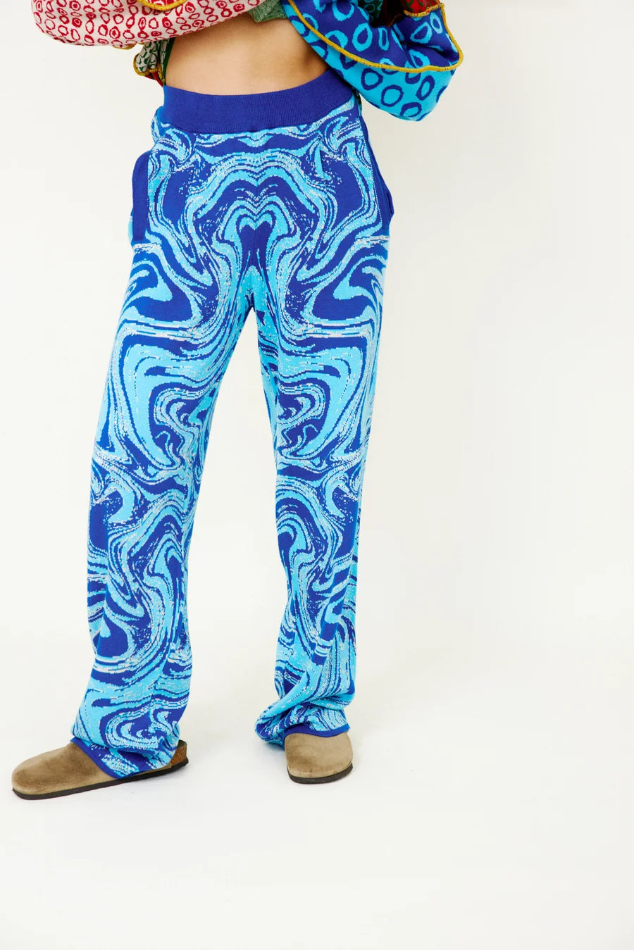Jacquard pattern knit trousers. Piped legs, elastic waist and side pockets.