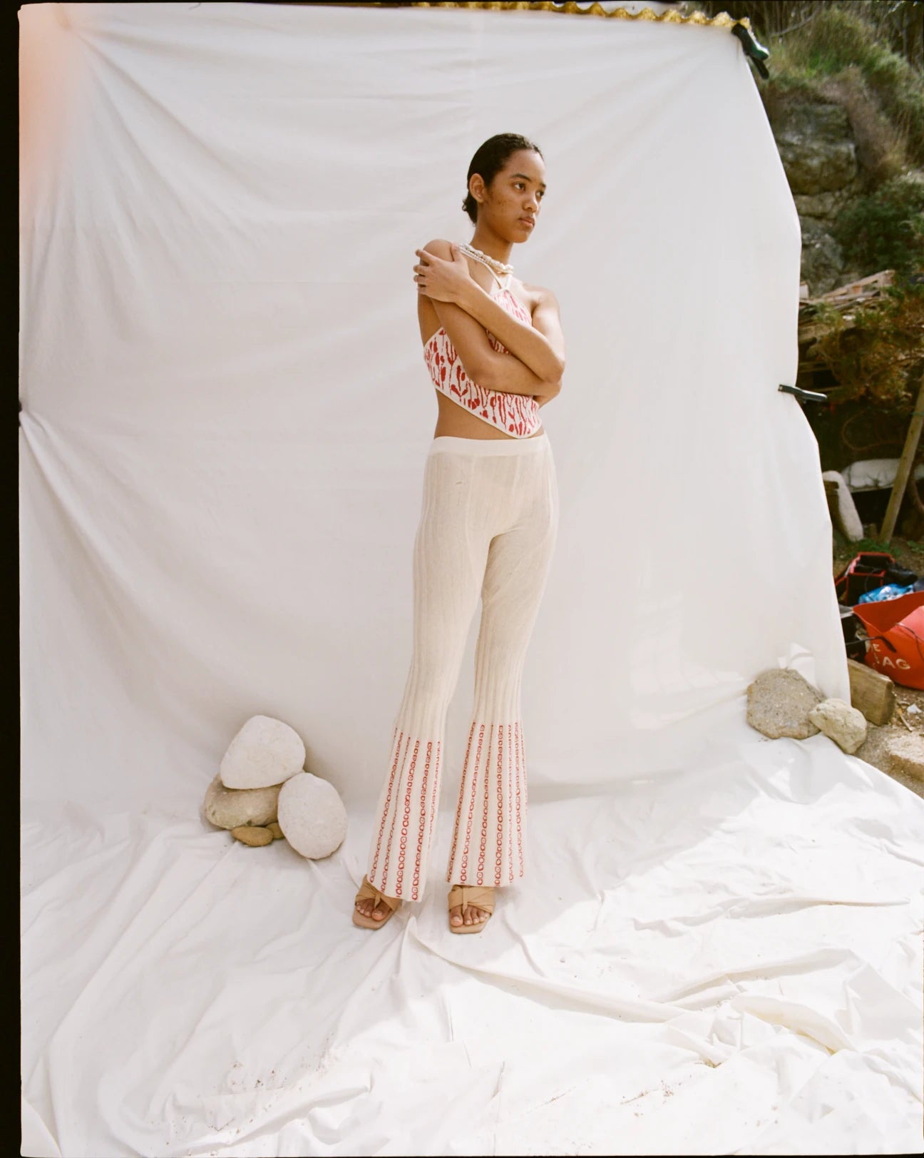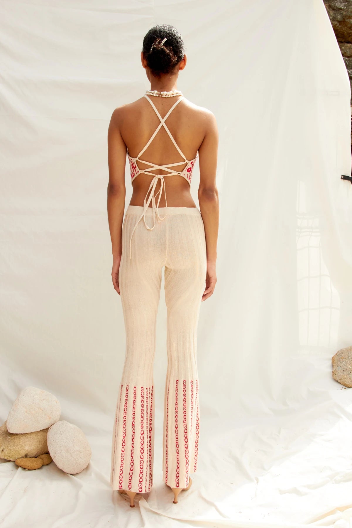 İspanyol paça, beli lastikli jakarlı, ince triko pantolon.