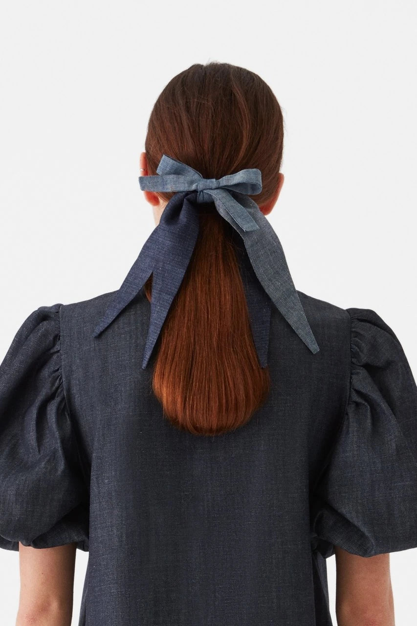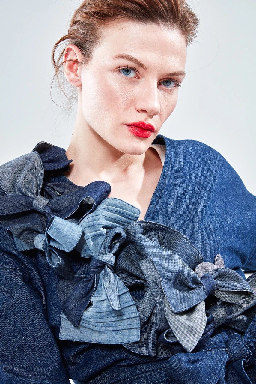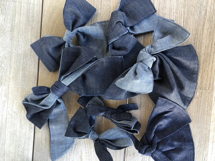 Denim elbiselerimizin üretim fazlası kumaşlarını atmaya kıyamıyoruz. İleridönüşüm ile onlardan farklı boylarda aksesuarlar yapıyoruz. Yaka iğnesi veya saç tokası olarak kullanabilirsiniz.
